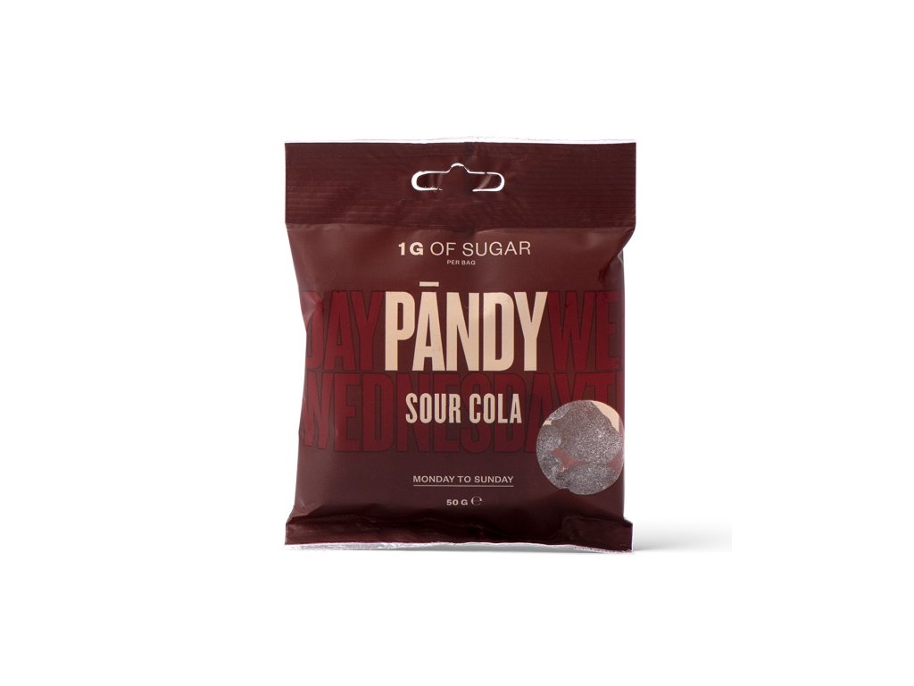 Pandy Sour Cola jsou kyselé gumové bonbony ve tvaru lebek s příchutí coly. Se sladidly. Obsahují minimální množství cukru a téměř žádný tuk. Skvěle se hodí jako nízkokalorická alternativa standardních želatinových bonbónů.